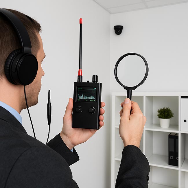 • RF Scanning: The use of radio frequency (RF) detectors is what the investigators employ to sniff out wiretap or surveillance bugging devices by picking up the audio or video signal.